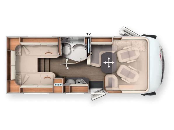 1ejers Carthago med perfekt indretning - Enkeltsenge og stor garage under med adgang fra begge sider. Stor dejlig L siddegruppe med vendbare forstole, sænkeseng i front, Dejligt køkken med stort 140 køl/frys, Toiletrum med brus,