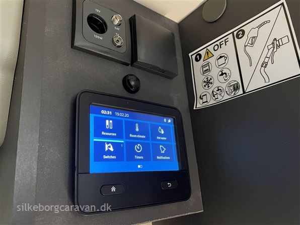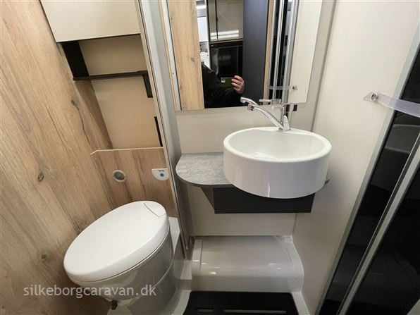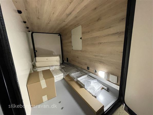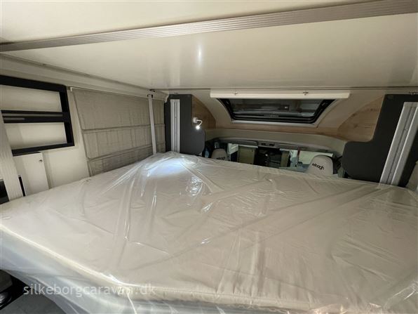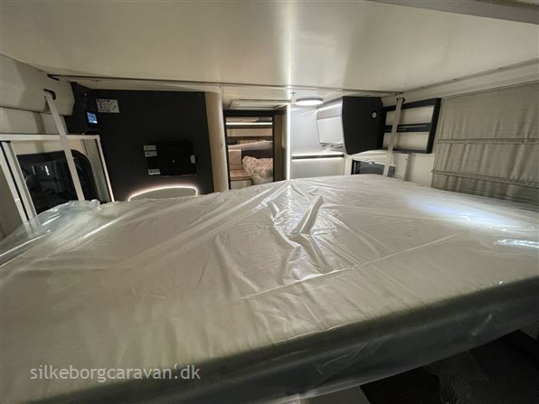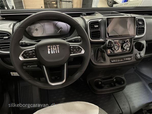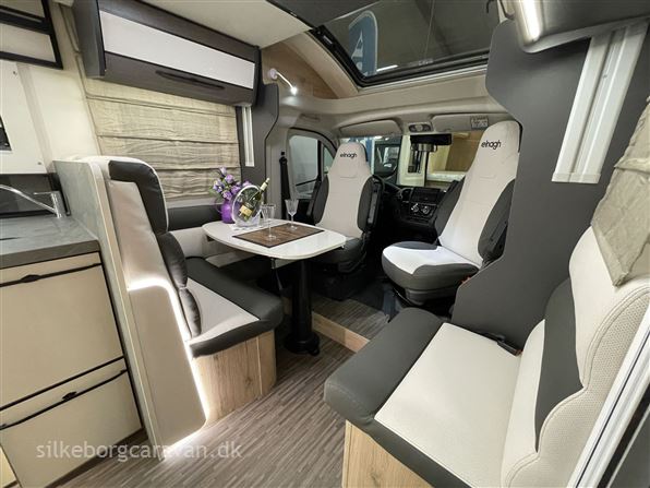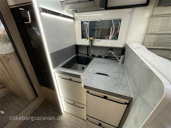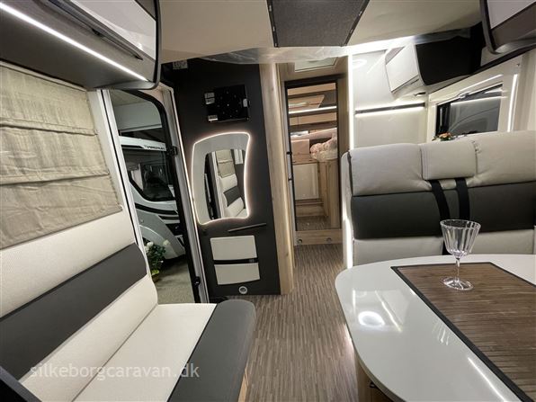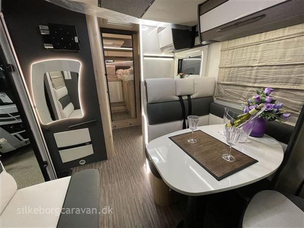 Komfortabel og rummelig spiseplads. Lyse træmøbler med grå årer. Poleret laminat finish. Blød sædepolstring med coated stofbeklædning - eller valgfrit øko-læder. Stort opbevaringsrum på siden af passagersædet. Værelser adskilt af en elegant trædør. Pladsbesparende elektrisk hæve/sænkeseng over siddegruppen. Bevægeligt sammenklappeligt bord med 360° rotation i front-to-face-modeller. Isofix beslag ved siddegruppen 2 stk på L-siddegruppe. Tv holder. Plissé gardiner i førerhuset.