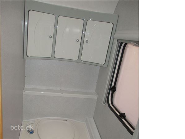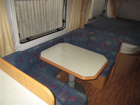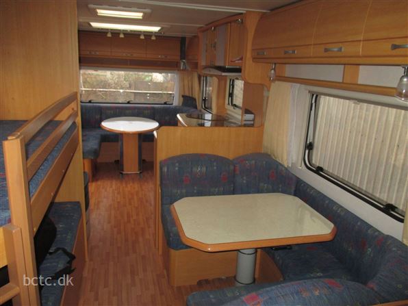 Dejlig familievogn. Indrettet med ekstra bred dobbeltseng (165 cm bred), kæmpe rundsiddegruppe, stort vinkelkøkken, TV-bord, børneafdeling med køjer og egen rundsiddegruppe.